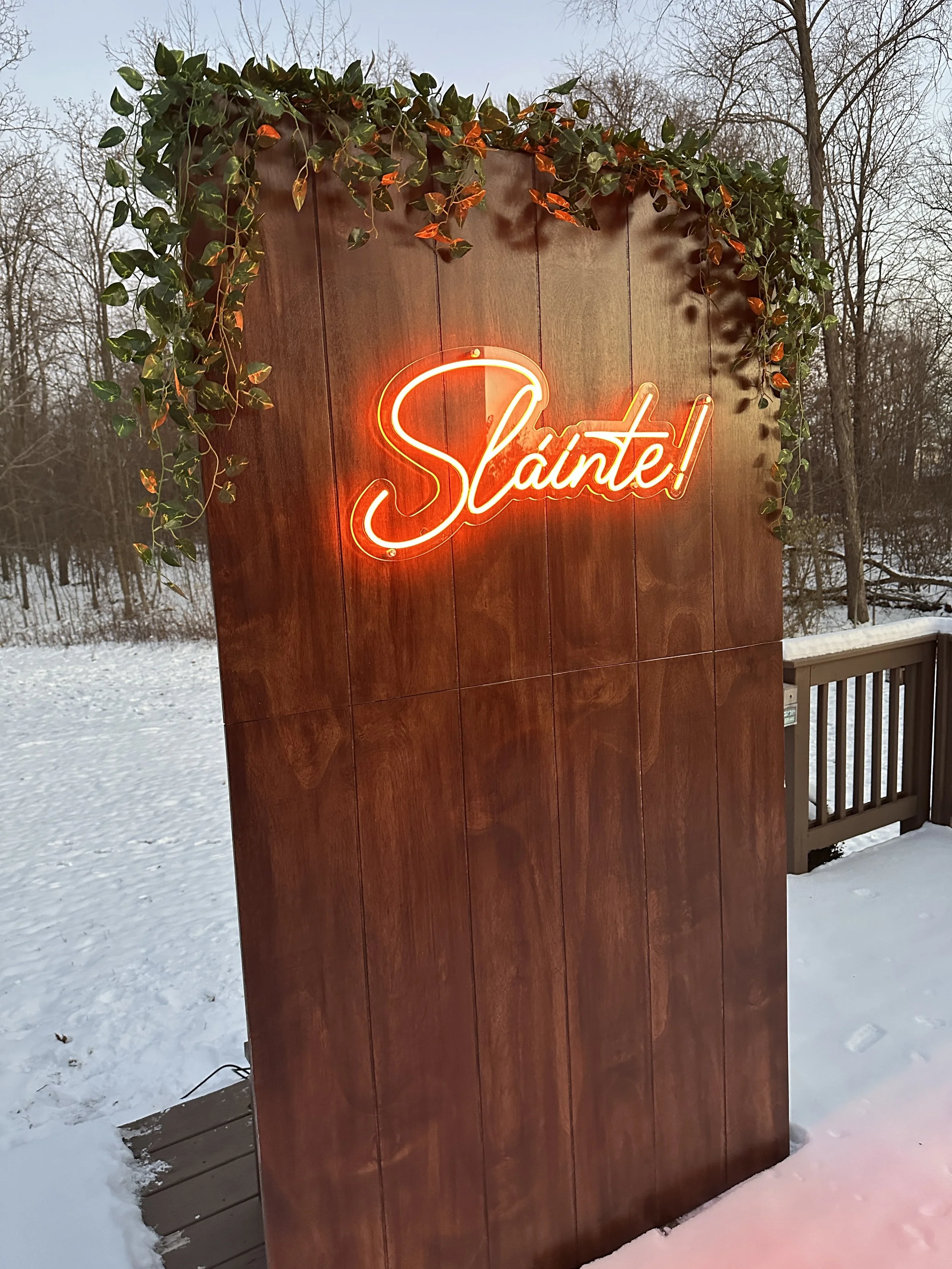 A 7 ft. tall warm, rustic backdrop designed for the perfect party photo. This large wooden wall features stained wood, cascading ivy, and a glowing Sláinte neon sign — ideal for guest selfies, group shots, and Instagram-worthy moments all night long.